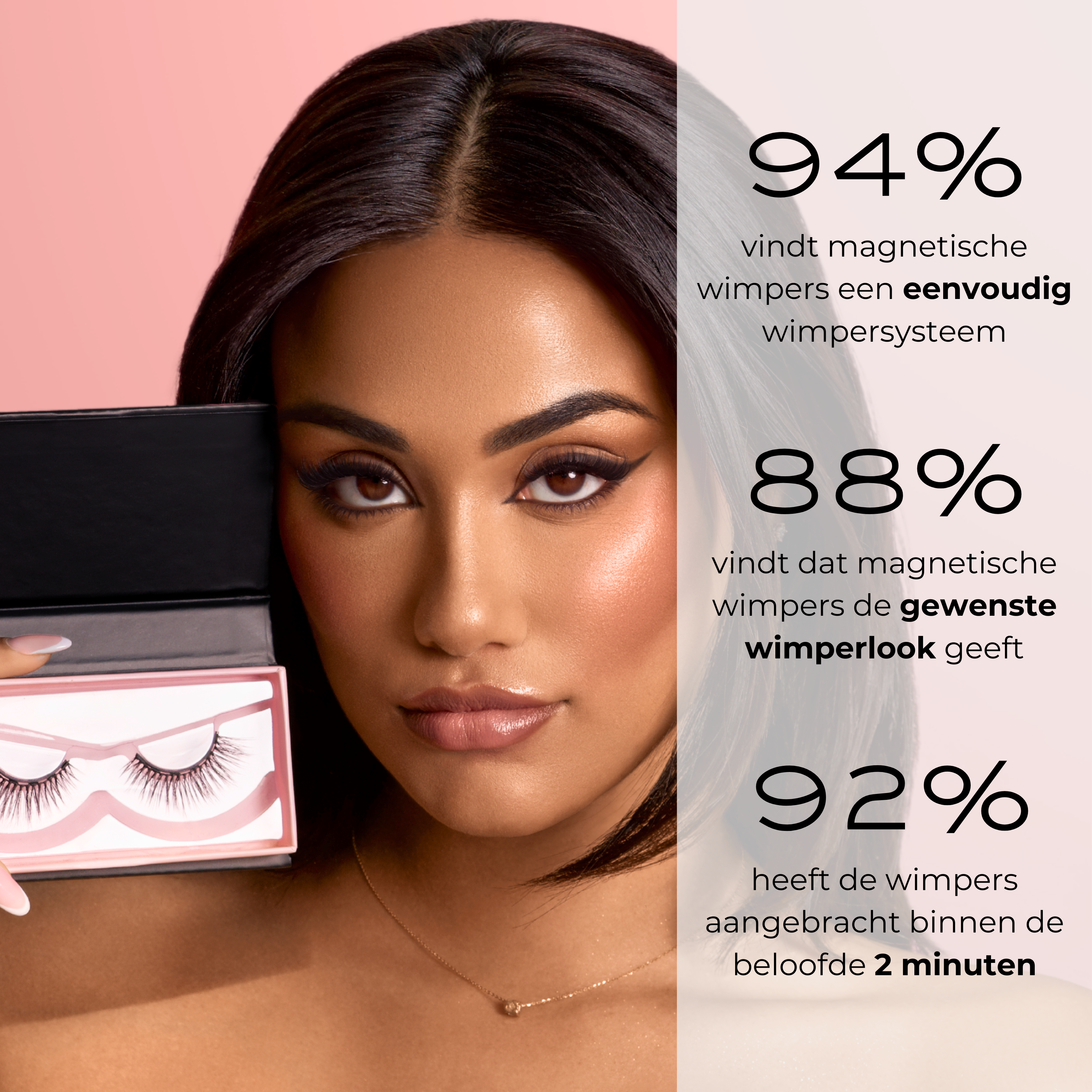 Dankzij de magnetische eigenschappen hechten de magnetische wimpers zich stevig aan de eyeliner, zonder gedoe met lijm of klonters. Je kunt de hele dag genieten van prachtige wimpers zonder dit te hoeven bijwerken dankzij de water- en veegbestendige formule.